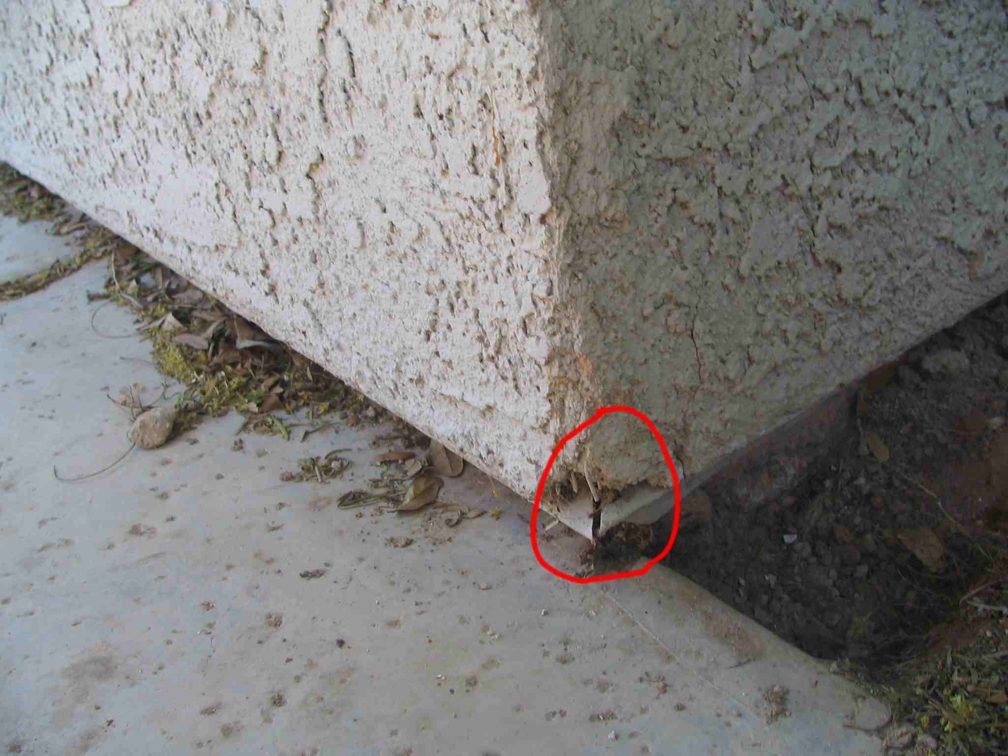 There they are...a pair of weep screeds forming the bottom of the walls meeting at this corner. Note that the metal lath that holds the stucco in place is also visible.